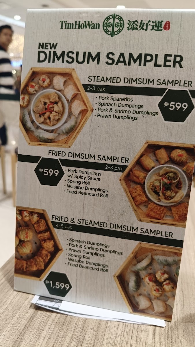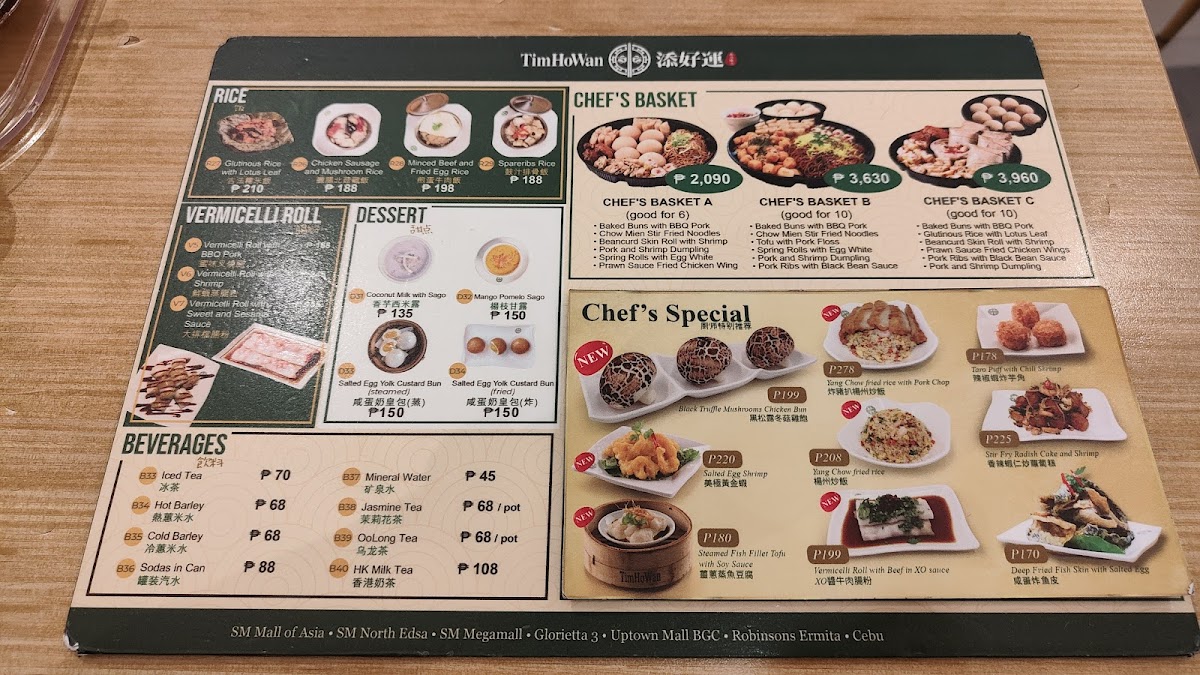 In conclusion, the menu at Tim Ho Wan in SM Megamall delivers a well-rounded dim sum experience that balances comfort and refinement, showcasing both classic staples and inventive flavors at approachable prices. Standouts like the Radish Cake and the deeply satisfying Beef Brisket Tendon Noodle Soup highlight the kitchen’s ability to bring out rich, authentic flavors, while the Fried Rice in XO Sauce adds a savory depth that complements the lighter offerings. The variety of Dim Sum remains the restaurant’s core strength, with items such as Spicy Chili Oil Dumplings and Braised Chicken Feet with Abalone Sauce offering bold, memorable bites. Meanwhile, comforting dishes like Congee with Lean Pork Century Egg and Salted Egg and Wonton Noodle Soup provide a soothing contrast. The menu also caters to those seeking indulgence, with favorites like Prawn Sauce Fried Chicken Wing, Chow Mien Stir Fry Noodles, and Fried Chow Mein delivering satisfying textures and flavors. Unique creations such as the Black Truffle Mushrooms Chicken Bun and Taro Puff with Chili Shrimp add a modern twist, while sides like Poached Fresh Greens with Oyster Sauce and Tofu with Pork Floss round out the meal nicely. Ending on a sweet note, the Taro Coconut Milk with Sago offers a refreshing and comforting dessert. Altogether, the menu reflects Tim Ho Wan’s signature approach-simple yet expertly executed dishes that make it a reliable destination for quality Hong Kong-style dining.